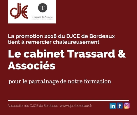Les étudiants de la promotion 2018 sont heureux de pouvoir compter sur le Cabinet Trassard & Associés, spécialisé en droit des affaires, qui apporte à nouveau son soutien au DJCE de Bordeaux.